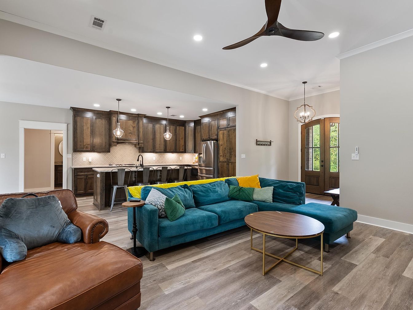 This open-concept living area seamlessly blends a cozy sitting space with a functional kitchen. Warm, medium-tone wood floors extend throughout, complementing the rich dark wood kitchen cabinetry. The kitchen features granite countertops and a stylish tile backsplash arranged in a diamond pattern, offering a classic touch. Industrial-style pendant lights hang above the spacious island with metal bar stools, perfect for casual dining. The living room boasts a vibrant teal sectional accented with green and yellow pillows, paired with a leather armchair in warm brown tones. Modern recessed lighting and a sleek ceiling fan enhance the airy, bright atmosphere, while double wooden front doors welcome natural light into the space.