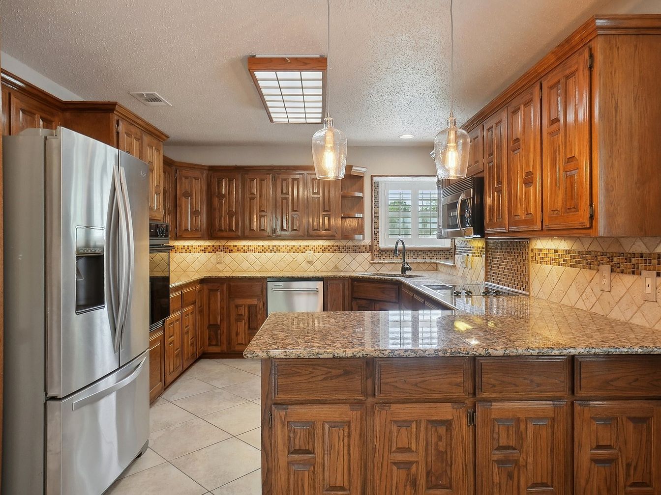 This kitchen features a spacious layout with an L-shaped counter and a central island, all topped with polished granite surfaces that add a touch of elegance. Rich wooden cabinetry with intricate panel detailing extends from the floor to the ceiling, providing ample storage. The tone of the wood creates a warm, classic ambiance, complemented by beige and brown mosaic tile backsplash with diamond patterns that bring visual interest. Stainless steel appliances, including a refrigerator, oven, dishwasher, and microwave, offer modern functionality. Two clear pendant lights hang over the island, contributing soft illumination and stylish charm, while the beige tiled flooring and a window above the sink brighten the space naturally.
