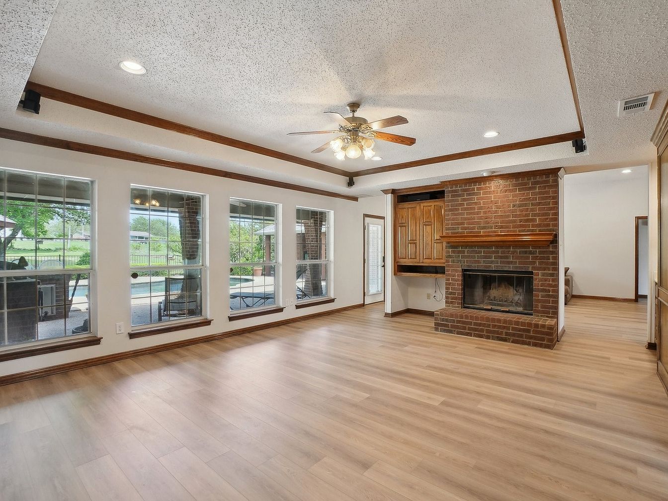 This spacious living room features a warm, inviting ambiance with light wood flooring that seamlessly complements the dark wood trim around the windows, ceiling, and baseboards. The large, grid-pattern windows offer expansive views of the backyard pool area, flooding the room with natural light. A brick fireplace with a wooden mantel anchors the room, adding rustic charm and functionality. The tray ceiling, accented with wood beams and recessed lighting, enhances the room’s architectural interest. A ceiling fan with multiple light fixtures provides both illumination and air circulation, making this living area comfortable and bright.