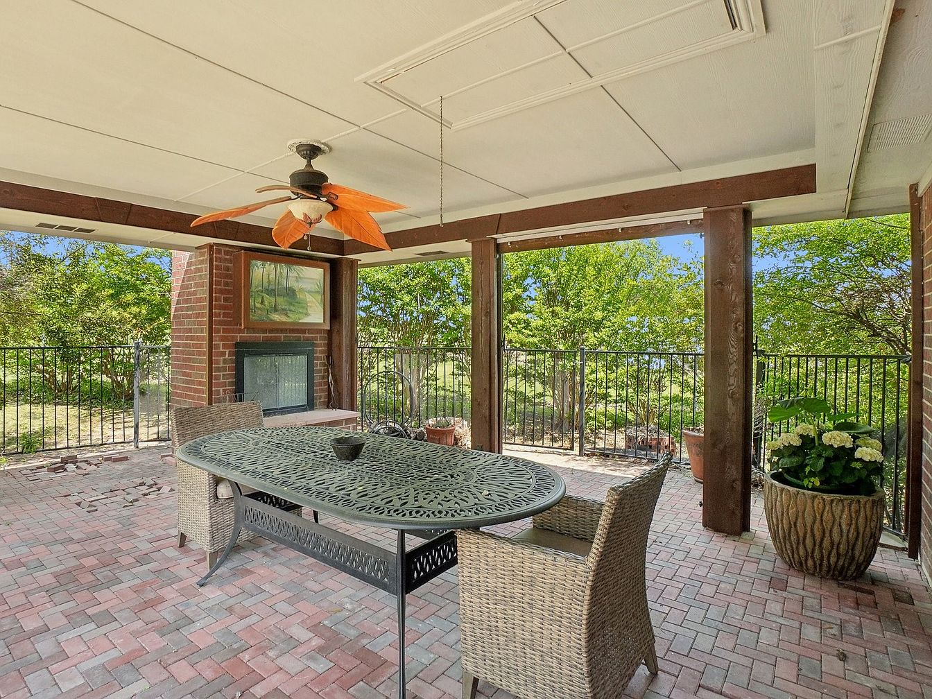 This covered patio offers a stylish outdoor dining space with a blend of comfort and function. The brick floor in a herringbone pattern adds texture and warmth, complementing sturdy wooden support beams and a white ceiling. A ceiling fan with leaf-shaped blades enhances the tropical vibe while providing air circulation. The wrought iron dining table, featuring intricate decorative details, is paired with two woven rattan armchairs, creating a cozy seating arrangement. A classic brick fireplace anchors one corner, with a framed landscape painting above it, and lush greenery surrounds the fenced patio, offering a serene view.