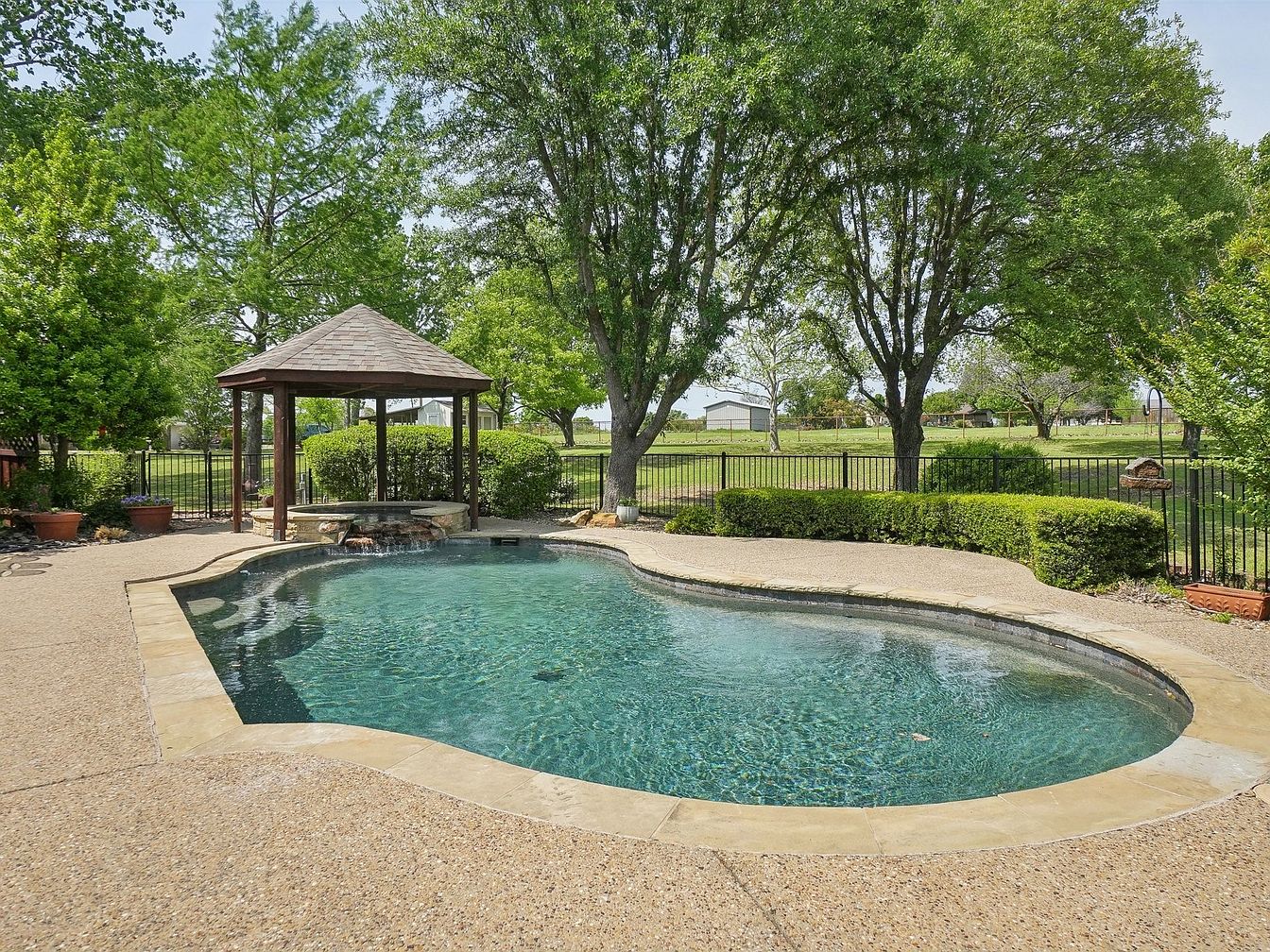 This stunning brick home, built with classic architectural elements, is located in Lucas, Texas, within the highly regarded Lovejoy Independent School District. Set on a sprawling 1.78-acre lot, this elegant property offers a private oasis with a beautiful blend of comfortable indoor living and exquisite outdoor entertainment spaces. The residence features two inviting living areas, a formal dining room perfect for hosting guests, and an eat-in kitchen that flows seamlessly into the living spaces. It includes three spacious bedrooms, highlighted by an oversized master retreat that provides a luxurious private getaway. The outdoor area is designed as a resort-style retreat, complete with a sparkling swimming pool, relaxing hot tub, a covered patio with an outdoor kitchen, and a fireplace—ideal for year-round gatherings and entertainment. Additional highlights include a seasonal pond enhancing the natural beauty of the property, a chicken coop for fresh farm eggs, and an extended two-car garage offering ample storage. Conveniently located just 1.7 miles from Lake Lavon, this home is listed at $849,900.