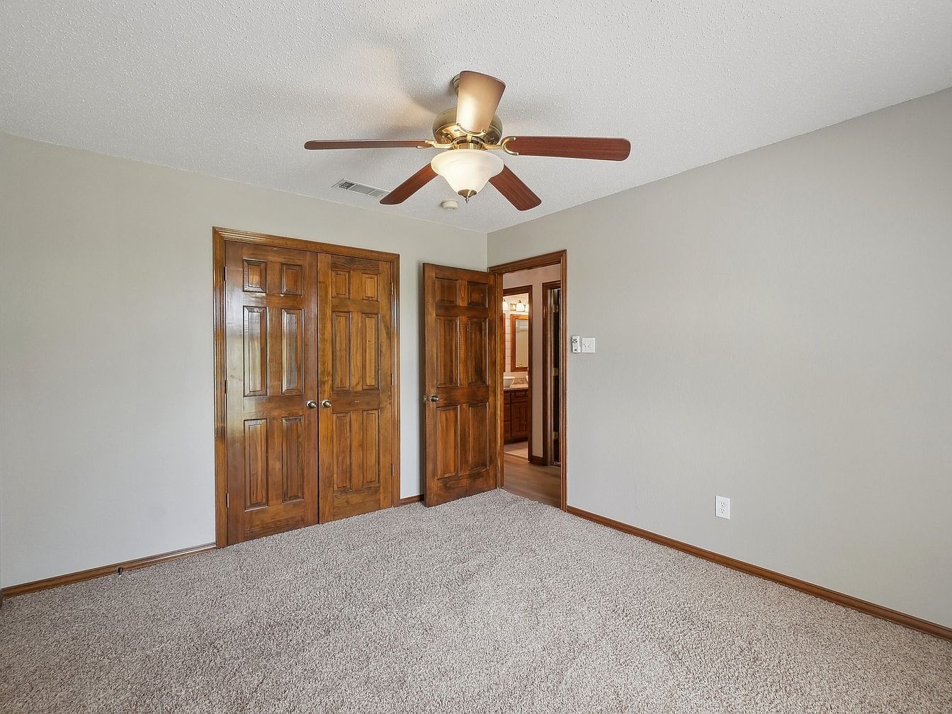 This bedroom corner features a neutral gray wall palette paired with warm wood tones, creating a cozy yet simple atmosphere. The beige carpet adds softness and texture underfoot, complementing the wooden closet doors and door frame, which exhibit a rich, polished finish. A ceiling fan with wooden blades and a central light fixture hangs overhead, contributing both functionality and subtle elegance to the space. The open doorway reveals a glimpse into an adjacent bathroom with similar wood cabinetry, maintaining cohesive design elements throughout the home. Overall, the layout highlights practicality with a touch of traditional warmth.