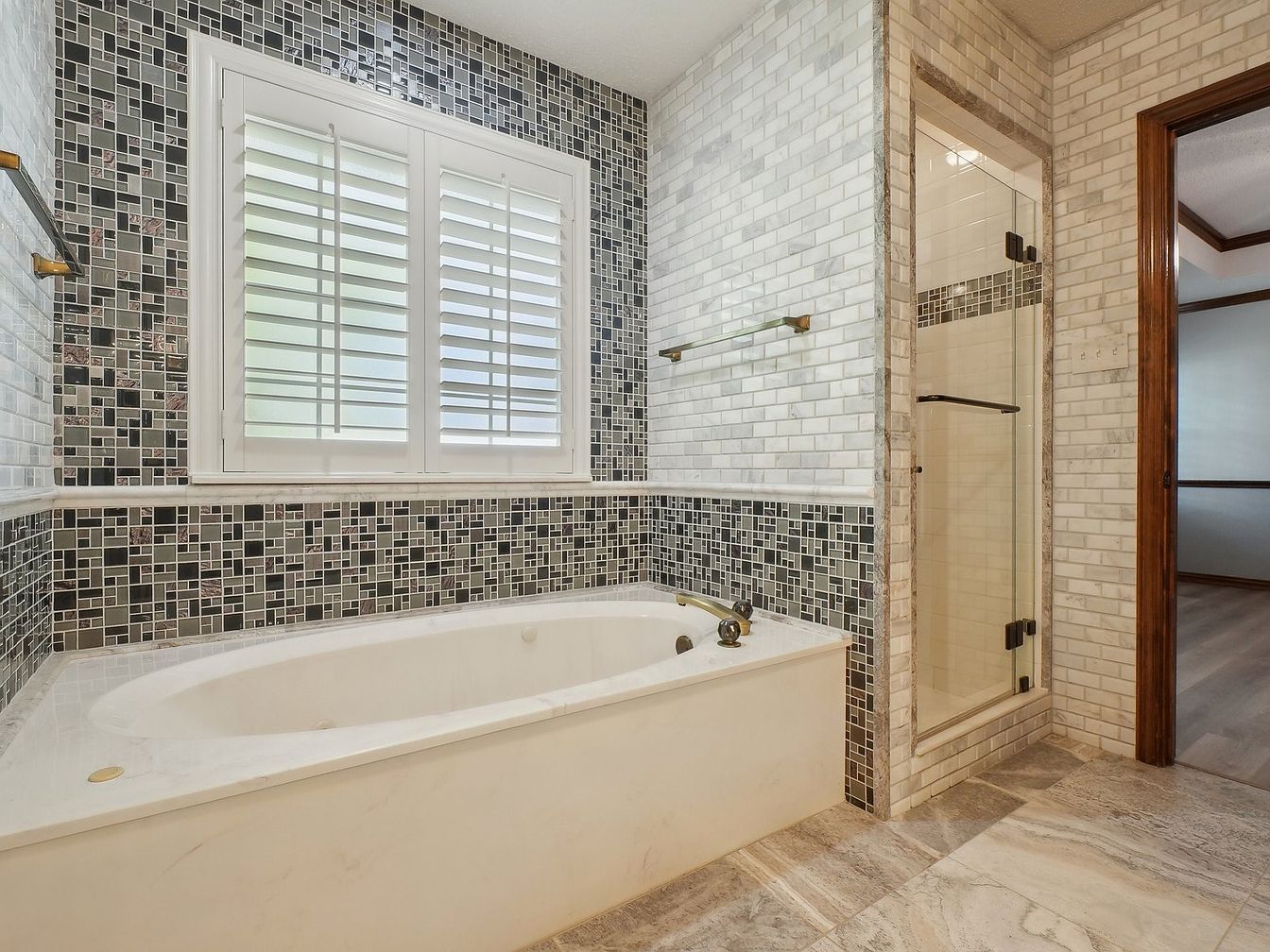 This bathroom features a spacious built-in tub surrounded by mosaic tile in shades of black, grey, and white, creating a modern geometric accent wall. The walls are predominantly covered in glossy white subway tiles, enhancing the bright and clean aesthetic. A large window with white plantation shutters above the tub offers privacy while allowing natural light to fill the space. The floor consists of large stone-patterned tiles in neutral beige and tan tones, complementing the overall sophisticated look. Adjacent is a glass-enclosed shower with matching mosaic trim, framed by marble-look tile adding subtle elegance to the design.