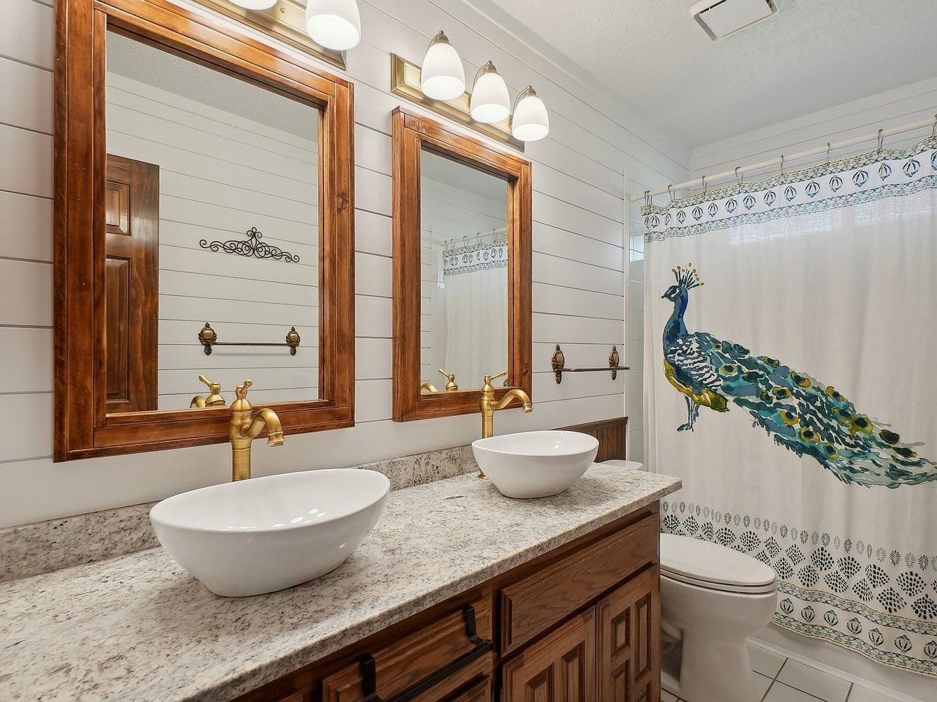This bathroom features a double vanity countertop with a speckled granite surface and two white vessel sinks. The faucets are a warm brass tone, complementing the rich wooden framed mirrors above each sink. The cabinetry below matches the mirror frames, showcasing a natural wood finish with dark hardware. The walls have horizontal shiplap paneling painted in a soft off-white, adding a subtle texture and coastal charm. In the background, a shower area is separated by a curtain adorned with a colorful peacock design, adding an artistic and playful accent to the serene, neutral color palette.