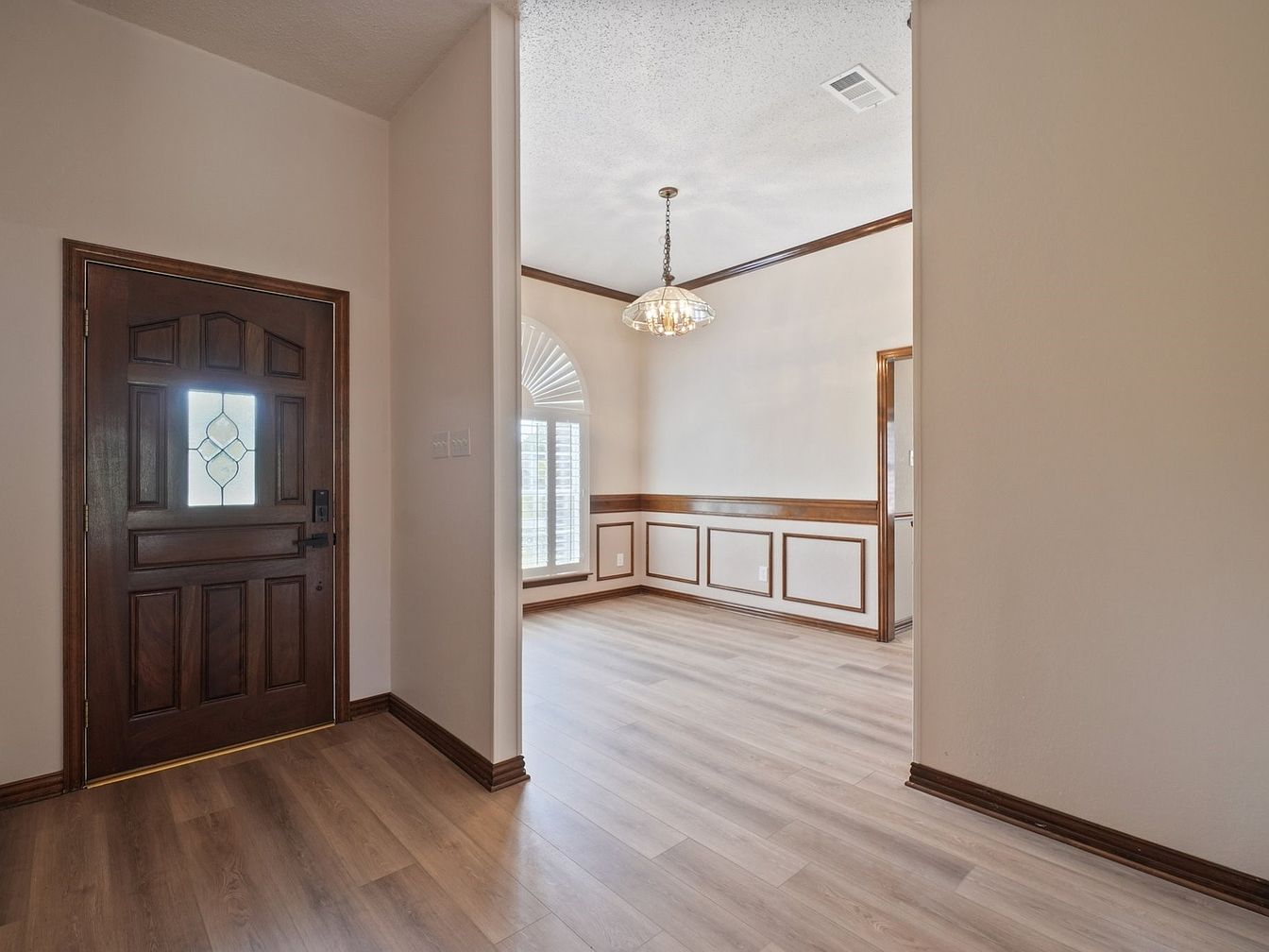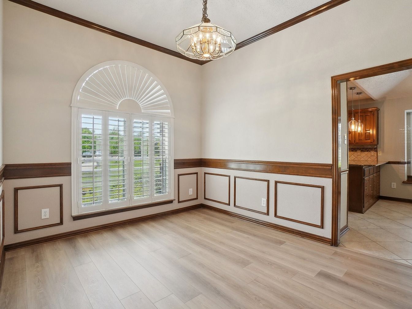 The entryway features a solid wood front door with a decorative glass inset, inviting natural light inside. The flooring throughout is a light, natural wood laminate that adds warmth and continuity between spaces. Transitioning from the entry into the adjacent dining room, the space boasts elegant wood wainscoting and crown molding that frame the soft, neutral walls. A large arched window with plantation shutters allows ample daylight, enhancing the airy feel. The dining area is anchored by a vintage chandelier with a glass drum shade, complementing the classic wood detailing and creating a welcoming atmosphere for gatherings.