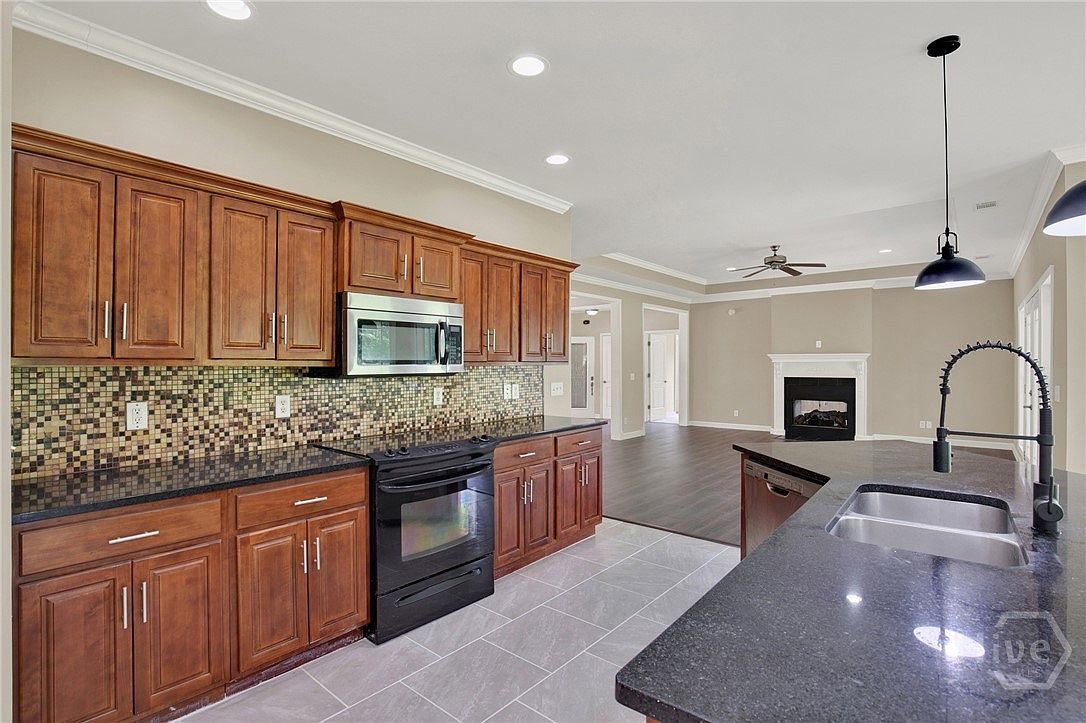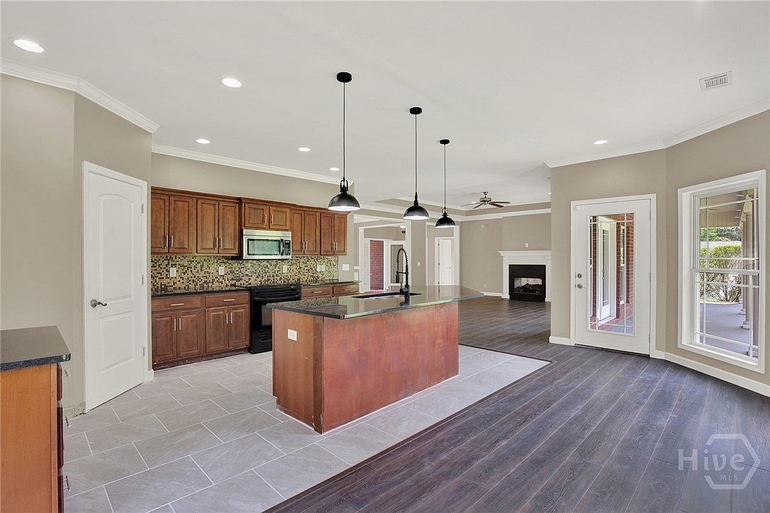 This spacious open-concept kitchen and living space features a blend of warm and neutral tones. The kitchen showcases rich wood cabinets and a large island with a dark granite countertop, highlighted by three matte black pendant lights. A mosaic tile backsplash adds a subtle texture behind the black stove and built-in microwave. The flooring combines light gray tile in the kitchen area with dark wood plank flooring in the adjoining living room, which includes a white trimmed fireplace and large windows that bring in natural light. Crown moldings and soft beige walls unify the elegant, yet welcoming aesthetic.