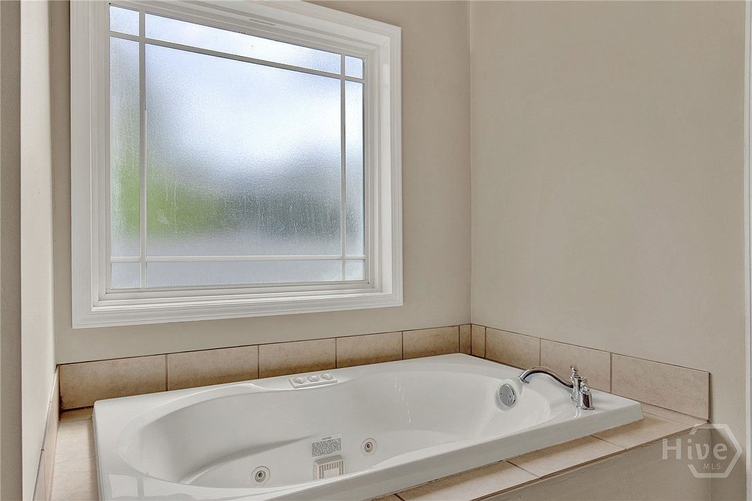 This bathroom features a built-in white bathtub with a subtle whirlpool system, set against a beige tiled surround. The tub is positioned below a large frosted window that allows natural light to filter in while maintaining privacy. The window’s white frame has a decorative grid pattern that adds a classic touch. Walls are painted in a soft neutral tone that complements the warm beige tiles around the tub. The chrome faucet and controls offer a modern contrast, creating a clean and serene bathing space with a minimalist, tranquil aesthetic.