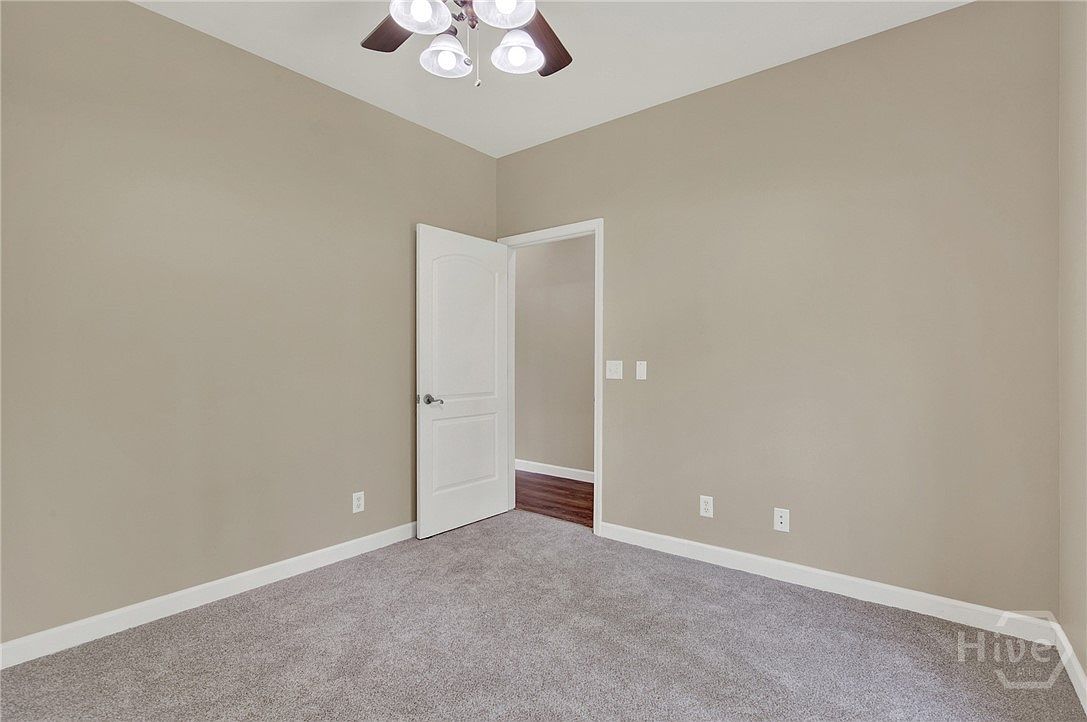 This cozy bedroom corner features soft, neutral taupe walls paired with plush gray carpeting that adds warmth and comfort underfoot. The white door contrasts gently against the wall color, inviting a smooth transition into an adjoining space with rich, dark hardwood flooring visible beyond. White baseboards frame the room neatly, and subtle modern molding accents around the door add delicate architectural interest. A ceiling fan with multiple frosted glass light shades hangs above, poised to enhance air circulation and illumination. The room’s minimalist, clean palette offers a versatile backdrop ideal for personalized décor and furnishings.