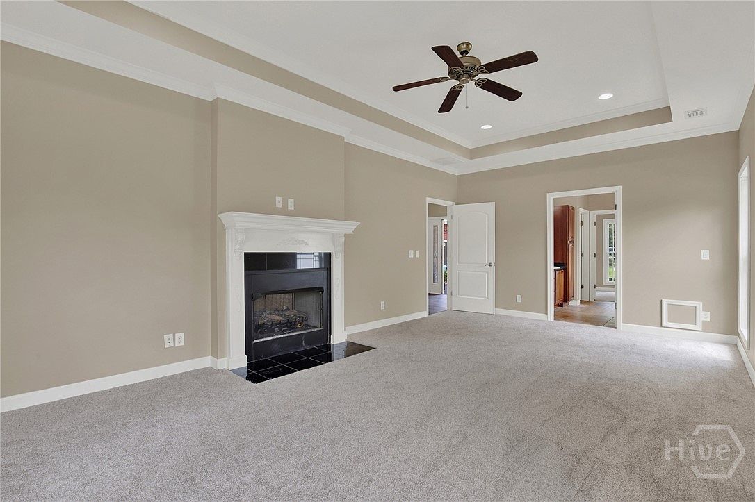 This spacious living room features a neutral beige wall palette complemented by soft gray carpeting, creating a calm and inviting atmosphere. The centerpiece is a classic white mantel fireplace with intricate molding details, surrounded by sleek black tile hearth accents. The tray ceiling adds height and sophistication, highlighted by crown molding and recessed lighting. A central ceiling fan with dark wood blades provides contrast and functionality. Open doorways lead to adjacent areas, offering seamless flow into other rooms. The room’s overall style is clean, airy, and ready for personalized furnishings and decor.