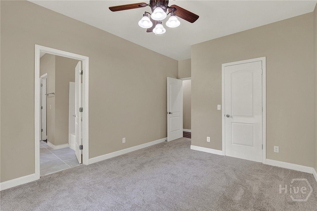 This bedroom features a soothing and neutral color palette with soft beige walls complemented by white trim and doors, creating a calm and inviting atmosphere. The plush, light gray carpeting enhances comfort underfoot. Two white paneled doors provide access to an adjoining bathroom and a closet or hallway, ensuring convenience. A ceiling fan with wooden blades and five light fixtures combines functionality with classic style. The room’s simple layout offers a versatile blank canvas, ready for personalized decor, while the natural light filtering through the open door adds a gentle warmth to the space.