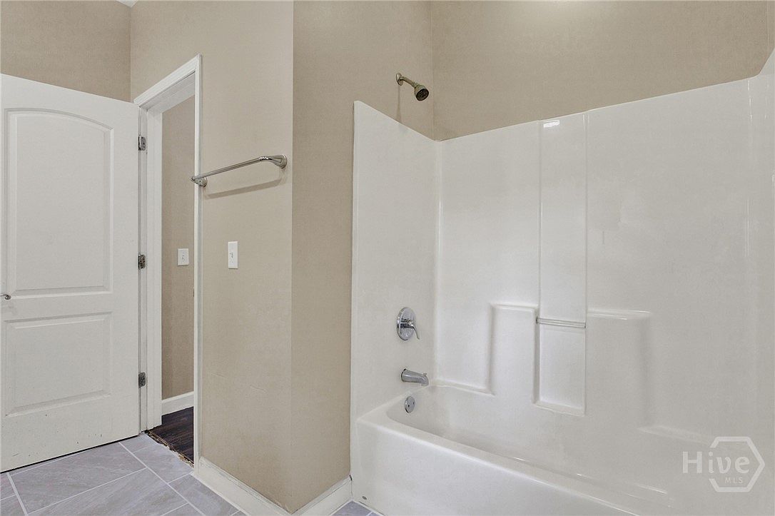 This bathroom section focuses on a clean, minimalist bathtub and shower combo. The tub surround is pristine white, smooth, and features subtle built-in shelves for toiletries, contributing to a streamlined look. The showerhead is a simple, functional design mounted high on the wall. Walls are painted in a warm beige tone, contrasting softly with the bright white tub. The floor is covered with large, gray tiles laid in a straight pattern, adding a sleek, modern feel. A silver towel bar is mounted to the wall near the entrance, directly opposite a white paneled door, suggesting a neat and practical space.