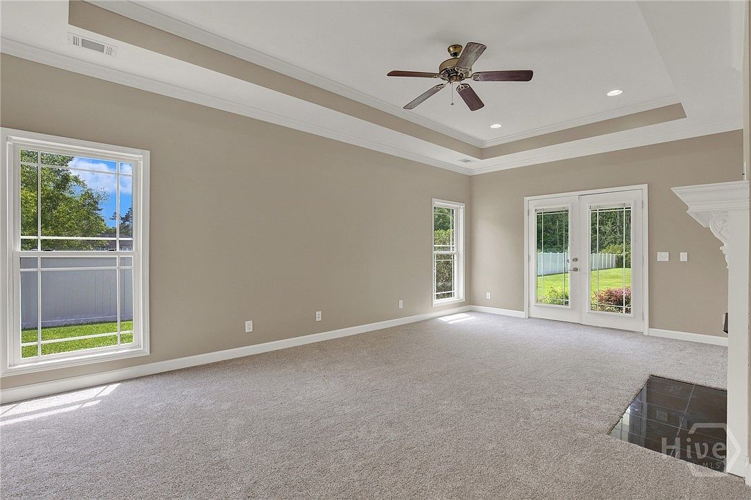This spacious living room features a subtle neutral color palette with beige walls and light gray carpeting that create a warm and inviting atmosphere. The room is brightened by natural light streaming through two tall windows and a set of French doors that provide a scenic view of the green backyard. The coffered ceiling adds architectural interest, highlighted by recessed lighting and a centrally placed ceiling fan with dark wood blades. A corner fireplace with a black tiled hearth anchors the space, offering a cozy focal point for gatherings. The room’s open layout enhances its airy, versatile ambiance.