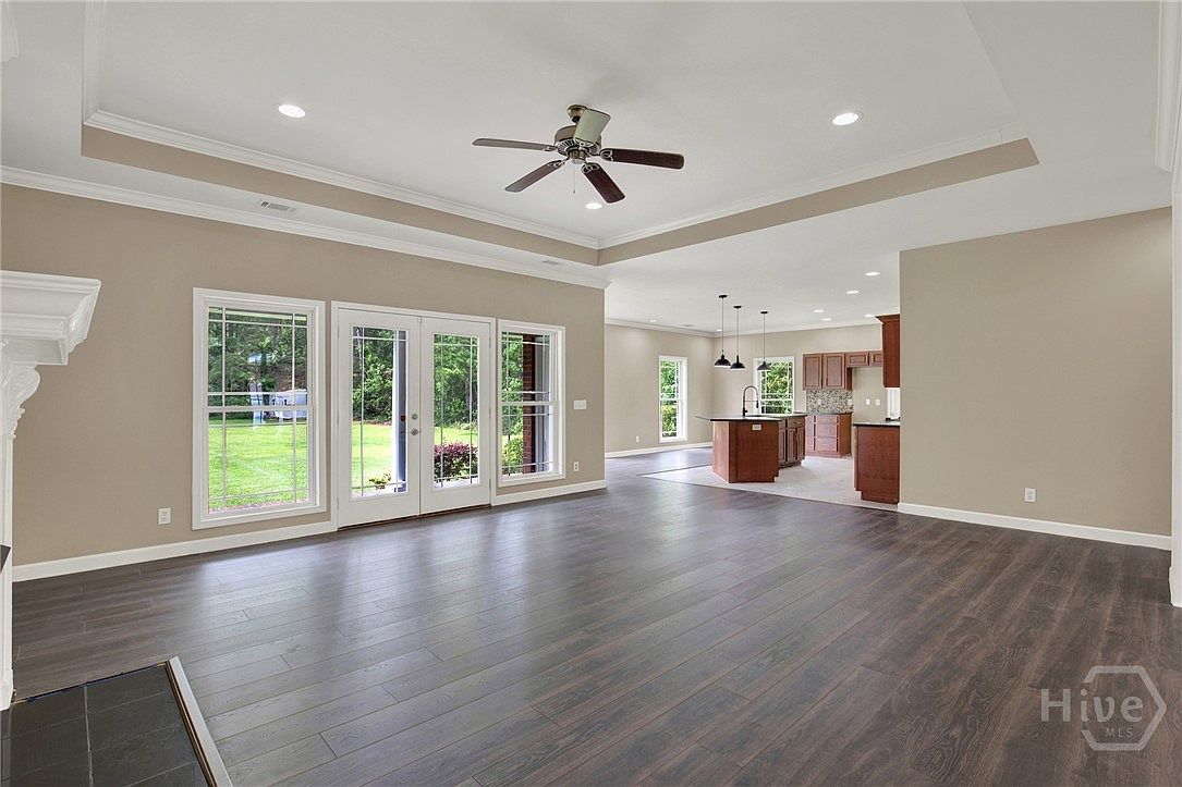 This spacious open living area flows seamlessly into the kitchen, creating an inviting and connected space. The room features wide-plank dark wood flooring that contrasts beautifully with the soft beige walls and crisp white trim. A tray ceiling adds architectural interest, complemented by recessed lighting and a central ceiling fan with dark blades. Large windows and French doors provide abundant natural light and extend views to the lush green backyard. The kitchen island, topped in dark granite, along with warm wood cabinetry, anchors the adjoining kitchen, visible in the background, enhancing both functionality and aesthetic harmony.
