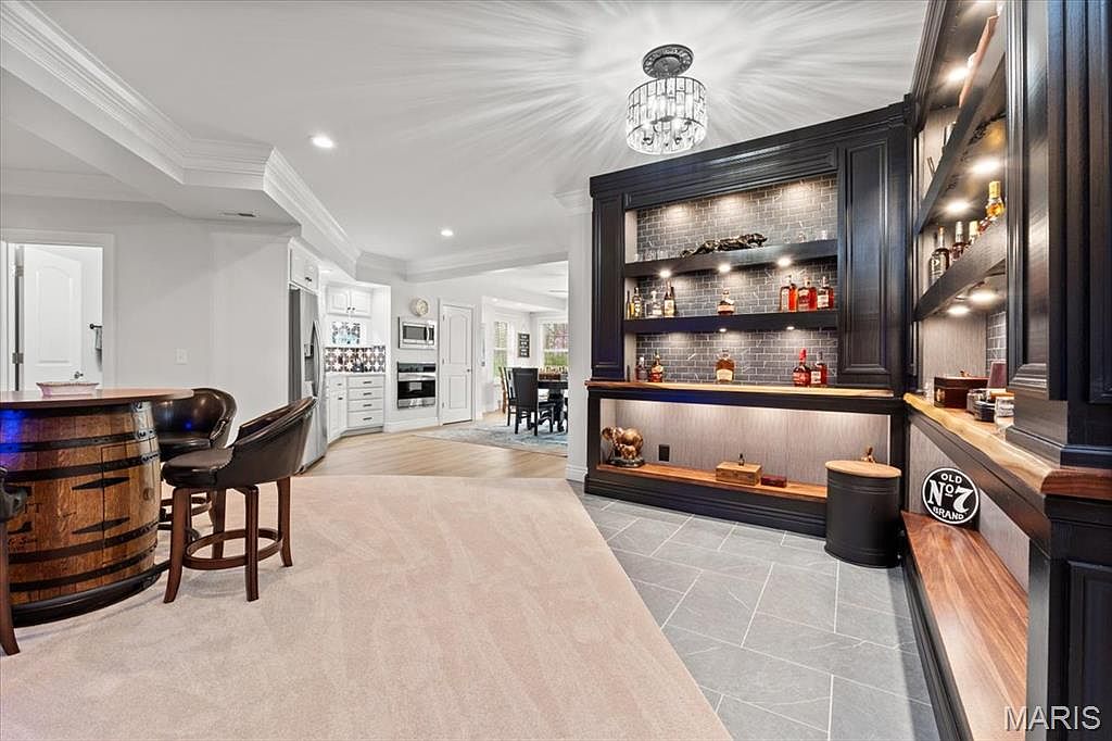 This cozy bar area features a blend of traditional and modern styling, with dark wood cabinetry creating a rich contrast against the light-colored walls and ceiling. The built-in shelving with under-cabinet lighting highlights an assortment of bottles and decor. The backsplash behind the shelves is composed of small, dark tiles adding texture, while the wooden countertops bring warmth to the space. A barrel-style table and cushioned stools provide seating, reinforcing the rustic charm. The surrounding spaces open into a kitchen and dining area, with a transition from tile flooring in the bar zone to plush carpeting and hardwood beyond. Crown molding and a sparkling chandelier add refined architectural detail.