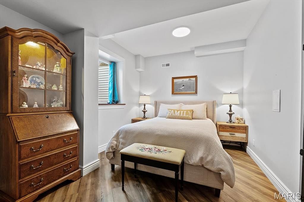 This intimate bedroom is warmly inviting, featuring a neutral palette of soft whites and natural wood tones. The focal point is a comfortable bed adorned with textured beige bedding and a decorative pillow that says “FAMILY,” evoking a sense of warmth and belonging. On either side of the bed, classic bedside tables hold traditional lamps, adding soft ambient lighting. A vintage wooden hutch, with glass doors displaying delicate figurines, adds an element of antique charm and character. The flooring is a rich, warm wood laminate, complementing the room’s cozy and timeless aesthetic. A window with a bright turquoise curtain allows natural light to brighten the space, which is capped by a modern, circular ceiling light, blending traditional and contemporary elements seamlessly.