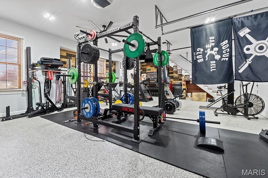 This home gym features a spacious layout with high ceilings and ample natural light streaming through two large windows framed in wood. The primary workout station is a robust black Rogue power rack equipped with a bench and color-coded weighted plates for varied resistance training. Complementary equipment like a rowing machine and resistance bands are neatly arranged, enhancing functionality. Walls include a stylish wood plank accent in warm tones that add texture and contrast to the otherwise light gray flooring and white walls. Black Rogue banners and rubber matting highlight the fitness theme, creating an inviting and motivating workout zone.