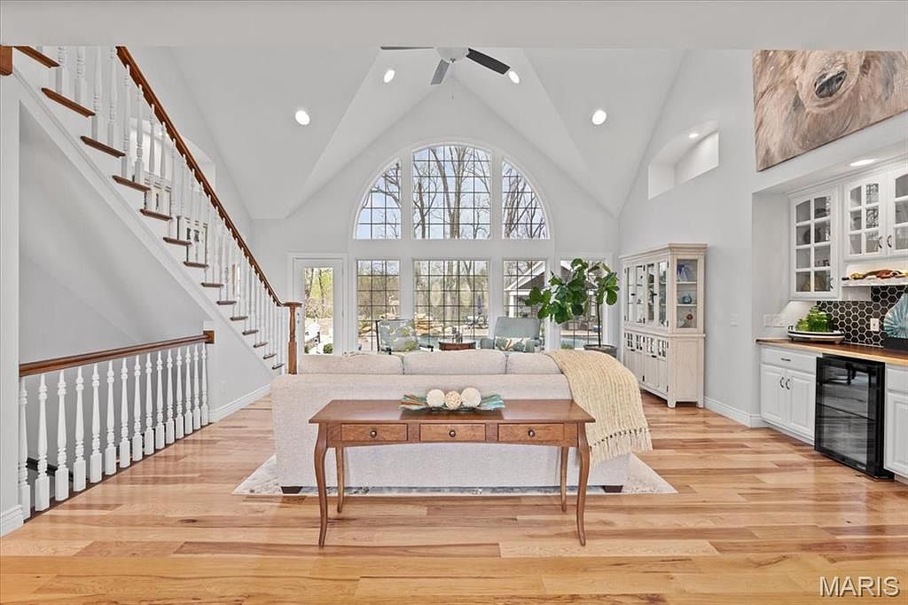 This living area features a bright and airy atmosphere with its vaulted ceilings and large, arched window that invites abundant natural light, creating a seamless connection to the outdoors. The space combines warm honey-toned hardwood floors with white walls and trim, enhancing the sense of openness. A beige sofa is positioned centrally with a sleek wooden console table behind it, adding function and charm. Adjacent to the living room, a clean, white kitchen with black hexagonal backsplash tiles complements the natural wood countertops. The wooden banister on the staircase adds a touch of classic elegance, harmonizing traditional and modern elements beautifully.