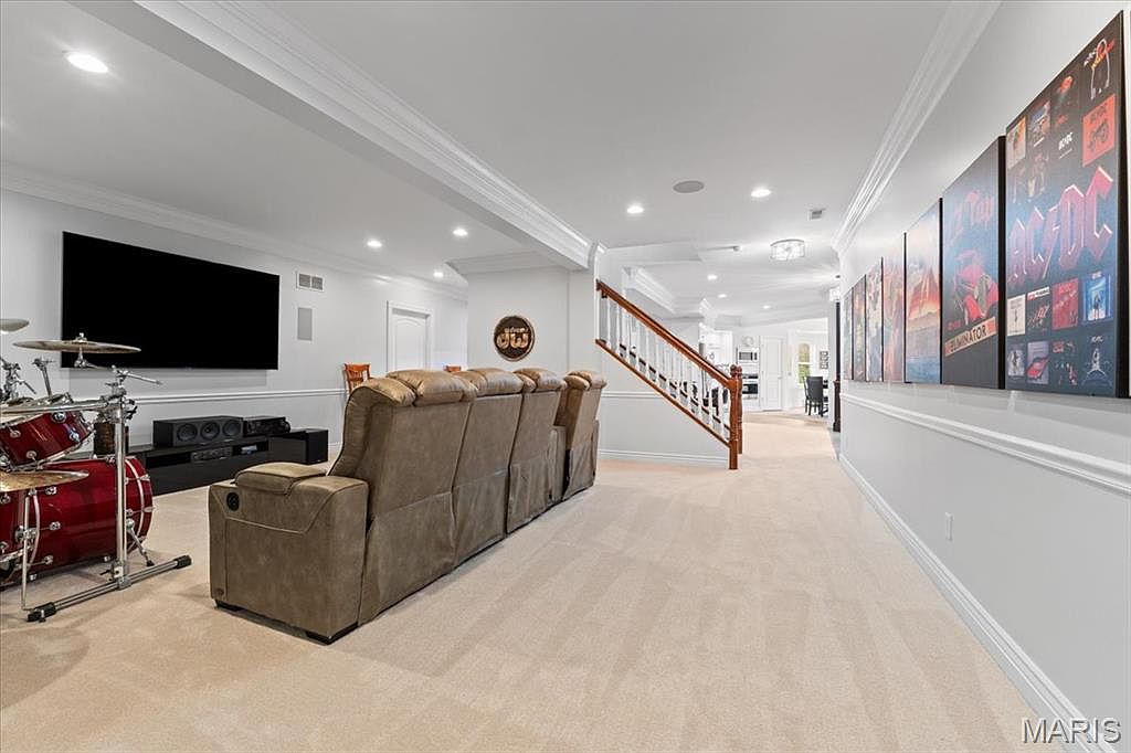 This spacious basement entertainment area features a cozy, taupe-colored reclining sofa positioned centrally to face a large wall-mounted flat-screen TV, ideal for movie nights or gaming. Adjacent to the seating is a red drum set adding a musical touch to the room’s ambiance. The space is illuminated by recessed ceiling lights and framed with classic white crown molding and wainscoting, enhancing the room’s sophisticated yet relaxed feel. A collection of vibrant rock band posters lines the far wall, infusing personality and color. Cream carpeting stretches through the room and hallway, connecting this area seamlessly to the rest of the home via the wooden staircase with white balusters.