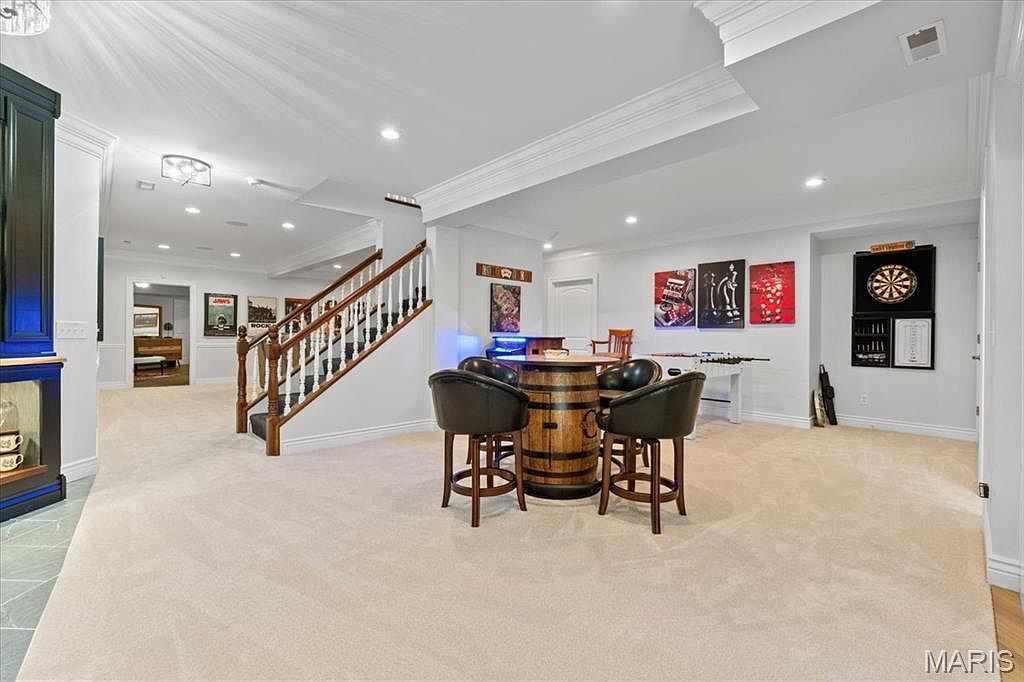 This spacious basement recreation area features beige carpeting that adds warmth and comfort, contrasted by crisp white walls and crown molding for a refined look. A prominent dark wood barrel table surrounded by four black leather chairs creates a cozy social spot. To the right, a dedicated dartboard setup is neatly installed within a recessed wall niche, highlighting a playful aspect. Three colorful, modern art pieces hang above a foosball table, enhancing the lively atmosphere. The wooden staircase with white balusters and natural wood handrail leads upstairs, lending traditional charm while recessed ceiling lights provide bright, even illumination throughout the open-plan space.