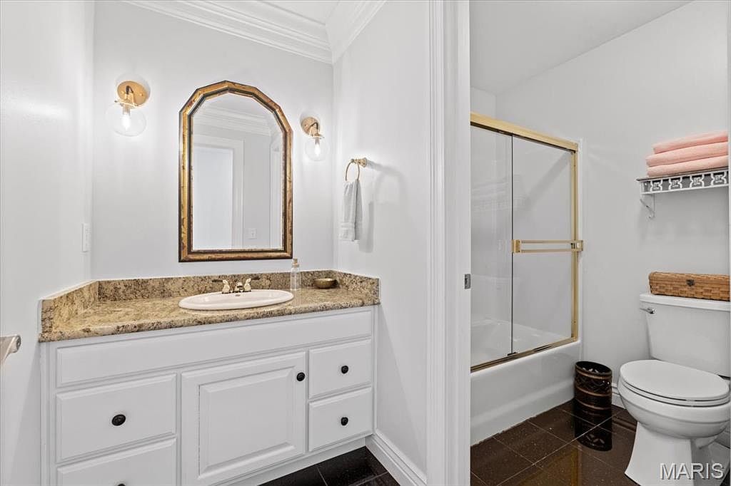 This bathroom features a clean, classic design with white walls and cabinetry that create a bright and airy atmosphere. The vanity showcases a speckled granite countertop with an integrated oval sink, accompanied by an elegant gold-framed mirror that adds a touch of sophistication. Two wall sconces with clear glass shades flank the mirror, providing warm, ambient lighting. Opposite the vanity is a white bathtub with sliding glass doors framed in brass, complementing the mirror’s gold tones. The floor is covered in glossy black tiles, adding contrast and grounding the space. A small shelf above the toilet holds neatly folded towels and a wicker basket, contributing to organized functionality.