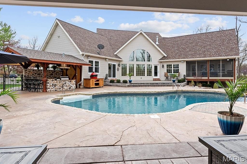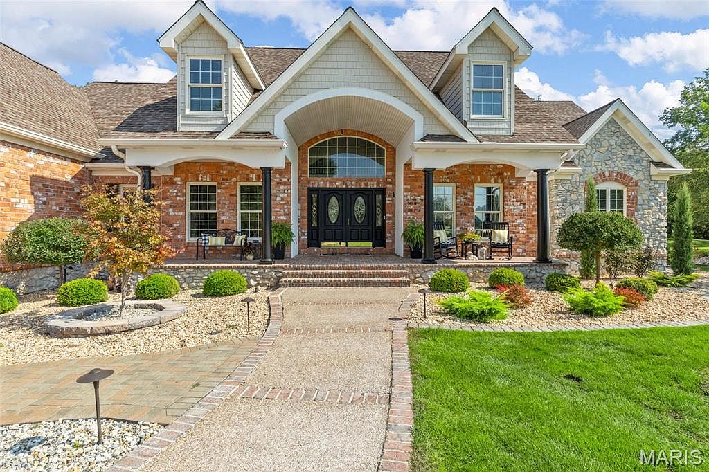 This exceptional custom-built luxury home in Wentzville, MO, is an exquisite example of traditional architecture blended with modern amenities. Nestled on over 3 acres of land, the residence spans an impressive 6,400 square feet, featuring 4 generously sized bedrooms. The home showcases a timeless brick and stone exterior, complemented by a welcoming covered front porch supported by elegant black columns and dormer windows that add character to the roofline. Built with meticulous attention to detail, every room is designed for both elegance and functionality. Outside, the property boasts a stunning outdoor oasis including a custom pool with a charming fountain, an expansive outdoor kitchen, and a comfortable living area ideal for gatherings. Practical features include a spacious 5-car garage and a dedicated hobby room, along with a convenient mud room. Listed at $2,000,000, this home is a perfect blend of sophistication, quality craftsmanship, and luxurious living on a vast and private plot.