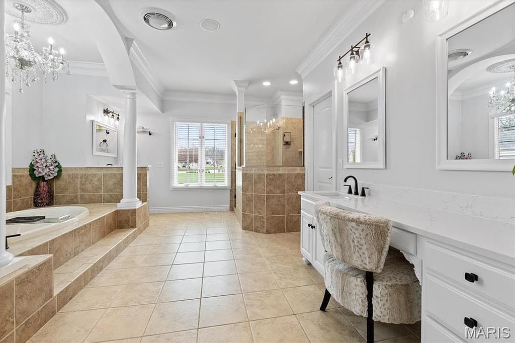 This master bathroom offers a spacious, elegant layout featuring a combination of warm beige floor and wall tiles alongside bright white walls and cabinetry. The space includes a large built-in bathtub with a decorative column and chandelier overhead, providing a touch of luxury. A separate walk-in shower with glass enclosure sits near a window that allows natural light to fill the room. Opposite the tub, a white double vanity with black fixtures includes a cozy upholstered chair for a makeup or grooming area. The design balances contemporary lighting and classic architectural details such as crown molding and medallions in the ceiling, resulting in a sophisticated and serene atmosphere.