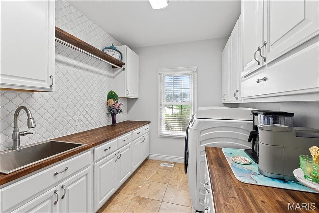 This bright laundry room features a clean, organized layout with white cabinetry that spans both walls, providing ample storage. A rich wood countertop adds warmth and contrast, complementing the white cabinetry and light gray walls. The backsplash showcases a subtle, geometric tile pattern that adds visual interest without overwhelming the space. The room includes a modern stainless steel sink with a sleek faucet, and a stacked washer and dryer tucked neatly near a window, which allows natural light to enhance the fresh, airy atmosphere. Small decorative touches, like a vase of flowers and a compact coffee maker, make the space both functional and inviting.