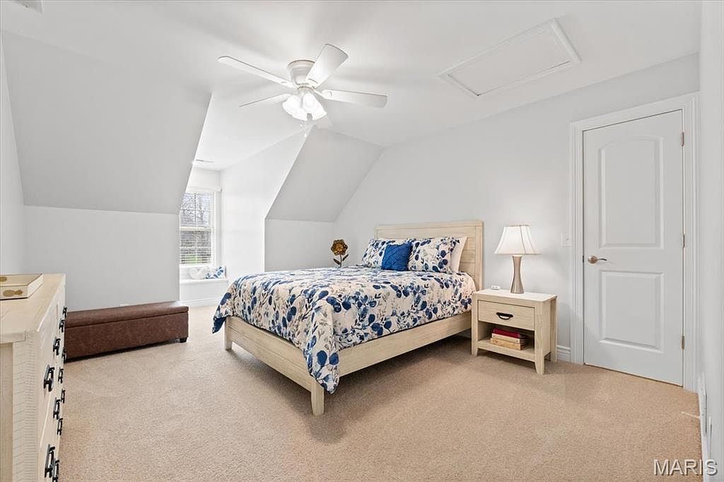 This bedroom features a calming palette of whites and soft beige carpeting that complements the light wood furniture. The bed is dressed in a floral-patterned comforter with blue accents, paired with matching pillows that add a gentle splash of color to the space. A ceiling fan with lights hangs overhead, providing a practical and stylish detail to the room’s sloped ceiling. A white nightstand with an elegant lamp offers convenience near the bed, while a brown storage bench sits beneath one of the two large windows, which invite ample natural light into this tranquil retreat.
