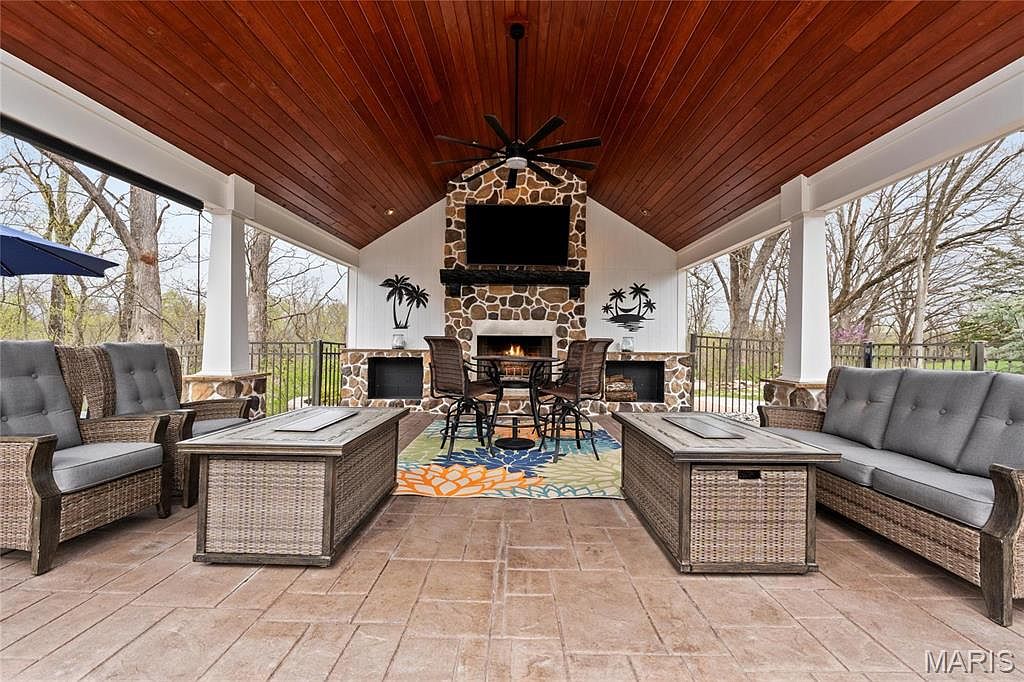 This inviting covered patio offers a cozy blend of indoor comfort and outdoor charm under a vaulted ceiling lined with rich, warm wooden planks. Neutral-toned wicker furniture, including cushioned sofas and armchairs in soft gray, flanks two matching rectangular fire tables, creating an intimate conversation zone. At the far end, a stone fireplace anchors the space with natural textured stones and a sleek black mantel supporting a mounted flat-screen TV. Complementing the fireplace is a vibrant floral rug and elegant iron dining chairs positioned around a round table. White support columns and railings frame leafy views, enhancing the tranquil ambiance.