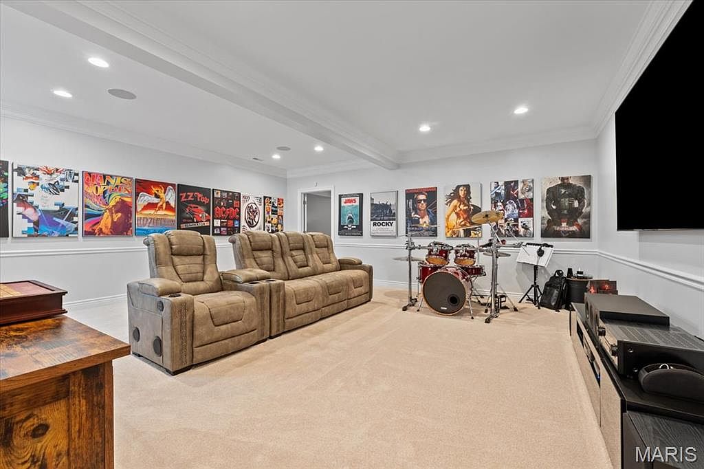 This entertainment room features a cozy and functional layout designed for relaxation and recreation. Beige carpet flooring complements the warm tones of the plush reclining theater seating arranged to face a large wall-mounted flat-screen TV. The walls are painted crisp white with elegant chair rail molding, adding a classic architectural detail. Movie and band posters line the walls, infusing the space with vibrant energy and personal character. A drum set occupies one corner, suggesting a musical hobby zone. Recessed ceiling lights provide soft, even illumination, enhancing the inviting atmosphere of this versatile leisure space.