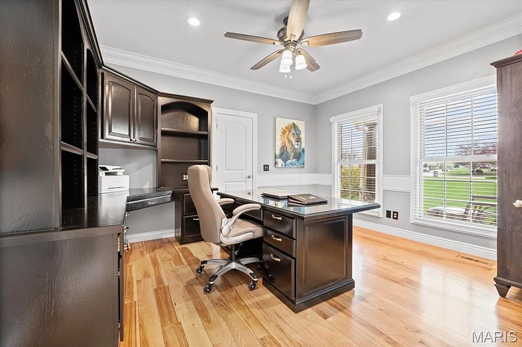 This dedicated home office features a spacious layout with rich, dark wood built-in cabinetry and desk units that provide ample storage and work surface area. The light hardwood flooring contrasts warmly with the furniture’s deep tones, adding brightness to the space. Walls painted in a soft gray enhance the crisp, clean look, complemented by white crown molding and trim that provide architectural detail. Two large windows with white blinds flood the room with natural light, creating a welcoming atmosphere. A comfortable beige leather office chair, a ceiling fan with light fixtures, and minimalist decor including a lion artwork complete the elegant and functional workspace aesthetic.