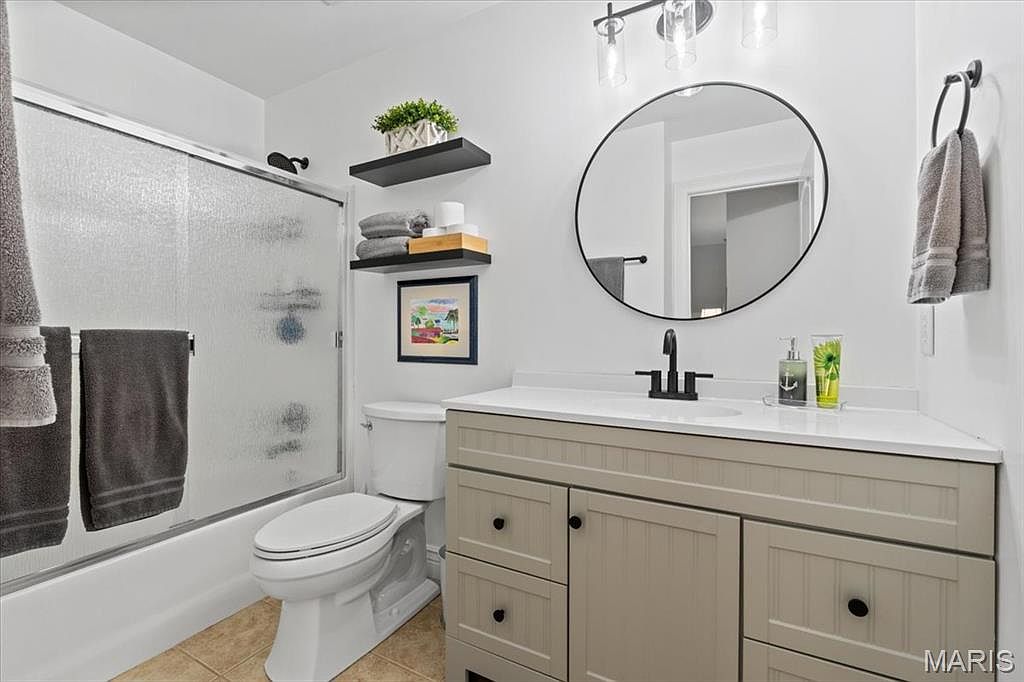 This bathroom area combines functionality with modern farmhouse charm. A soft gray vanity with paneling detail supports a sleek white countertop and is paired with a matte black faucet that matches the round framed mirror above. The walls are bright white, enhancing the light and spacious feel. Black floating shelves add a contemporary touch and provide storage, featuring neatly folded towels and decorative elements. A framed colorful artwork adds personality near the toilet. Frosted glass sliding shower doors and neutral beige floor tiles complete the clean, cohesive, and inviting space.