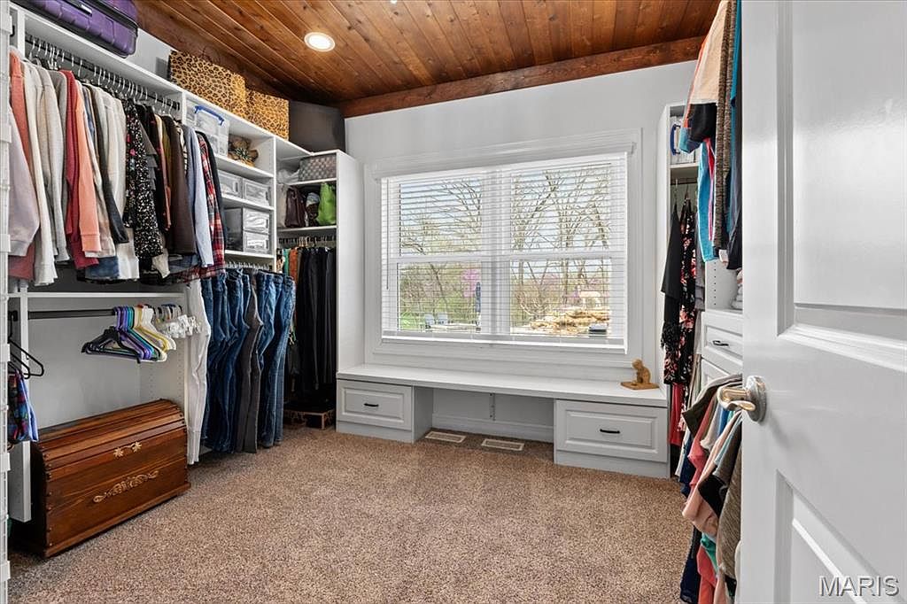 This spacious walk-in closet features a well-organized layout with white shelving units and ample hanging space on both sides. The closet includes a window seat with built-in drawers underneath, providing both seating and extra storage while allowing natural light to brighten the room. The ceiling is clad in warm, natural wood planks, creating a cozy contrast against the white walls and cabinetry. Neutral-toned carpeting adds softness underfoot. Clothes and accessories are neatly arranged, making the space highly functional and inviting for daily use.