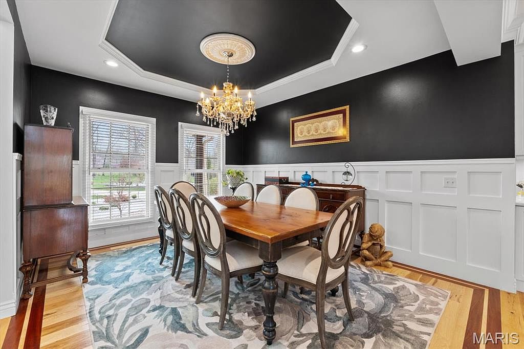 This elegant dining room features a striking black and white color scheme with the upper walls painted in deep charcoal and classic white wainscoting covering the lower half. The ceiling follows the two-tone design with a black inset and white crown molding, centered by an ornate gold chandelier adding a luxurious touch. A large rectangular wooden table with dark, turned legs occupies the center, surrounded by upholstered chairs with oval backs and dark frames. Beneath the table lies a floral-patterned area rug in muted blues and greys, complementing the natural wood floor with a dark border. Antique-style wooden furniture and tasteful decorative accents complete the sophisticated setting, illuminated by natural light from two large windows with white blinds.