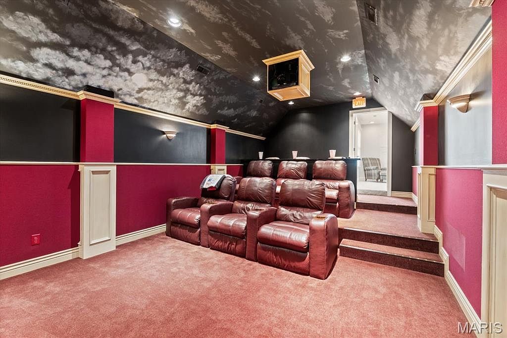 This cozy home theater features tiered seating with plush burgundy leather recliners arranged in two rows, ensuring an optimal view for every guest. The walls combine deep red wainscoting with black panels above, accented by cream crown molding that adds a touch of classic elegance. The ceiling boasts a cloud-like mural, enhancing the immersive ambiance. Recessed lighting provides subtle illumination, complemented by wall sconces. Carpeted steps and floor in a matching warm brown tone contribute to the inviting atmosphere. A ceiling-mounted speaker or projector housing is centered, enhancing the entertainment experience in this intimate media room.