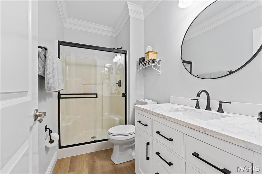This bathroom features a clean and modern design with a white vanity topped by a light marble countertop and black hardware, lending a sleek contrast. The large, round mirror above the sink complements the dark faucet fixtures, emphasizing contemporary simplicity. Across from the vanity, there is a glass door shower enclosure framed in black, enhancing the room’s minimal yet stylish aesthetic. The space is brightened by soft neutral wall colors and natural light wood-like flooring, which adds warmth to the otherwise cool-toned room. Subtle details like a small shelf for toiletries and neutral bath linens complete the functional layout.
