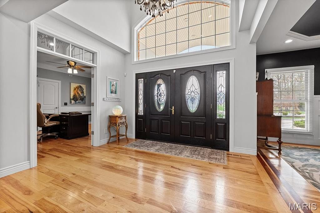 This elegant foyer features a striking black double front door with detailed oval glass inserts, set beneath a large arched transom window that floods the space with natural light. The flooring is a warm, honey-toned hardwood that extends throughout, adding warmth and richness to the entry. White walls and trim create a clean, modern backdrop, contrasting beautifully with the dark door. A small, ornate wooden side table with a globe lamp adds charm by the wall. To the left, a glimpse into a home office shows dark wood furniture and a ceiling fan, while to the right, an open transition leads into a living space accented by a black wall and large windows framed with white blinds.