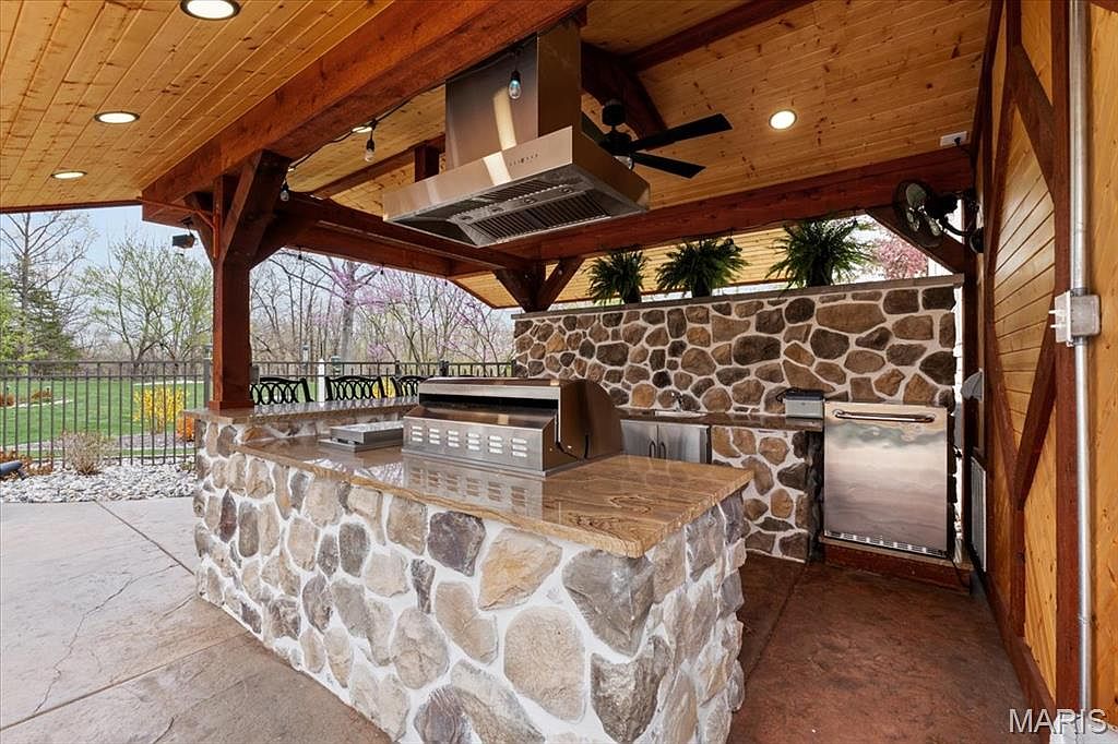 This covered outdoor kitchen exudes rustic charm combined with modern convenience. The space features robust stonework enclosing a large countertop and built-in grill, perfect for al fresco cooking. The ceiling is clad in warm wooden planks with exposed beams, complemented by recessed lighting and a black ceiling fan for comfort. Stainless steel appliances, including a vent hood and a refrigerator, add a sleek, professional touch. Against the stone backdrop, green plants provide a refreshing natural detail. The open layout faces a fenced yard, creating a seamless indoor-outdoor entertaining experience framed by natural elements and functional design.