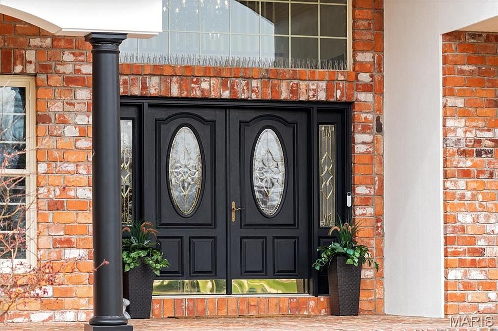 This striking front entrance features a bold black double door with elegant oval stained glass inserts, framed by sidelights that echo the glass design, adding sophistication and natural light. The door is set against a warm red brick facade, creating a rich contrast with the dark door and highlighting the home’s traditional character. Flanking the doorway, tall black planters filled with lush greenery introduce a touch of nature and softness. A sturdy black column supports the overhang, providing balance and a classic architectural element that frames this inviting and stylish entryway.
