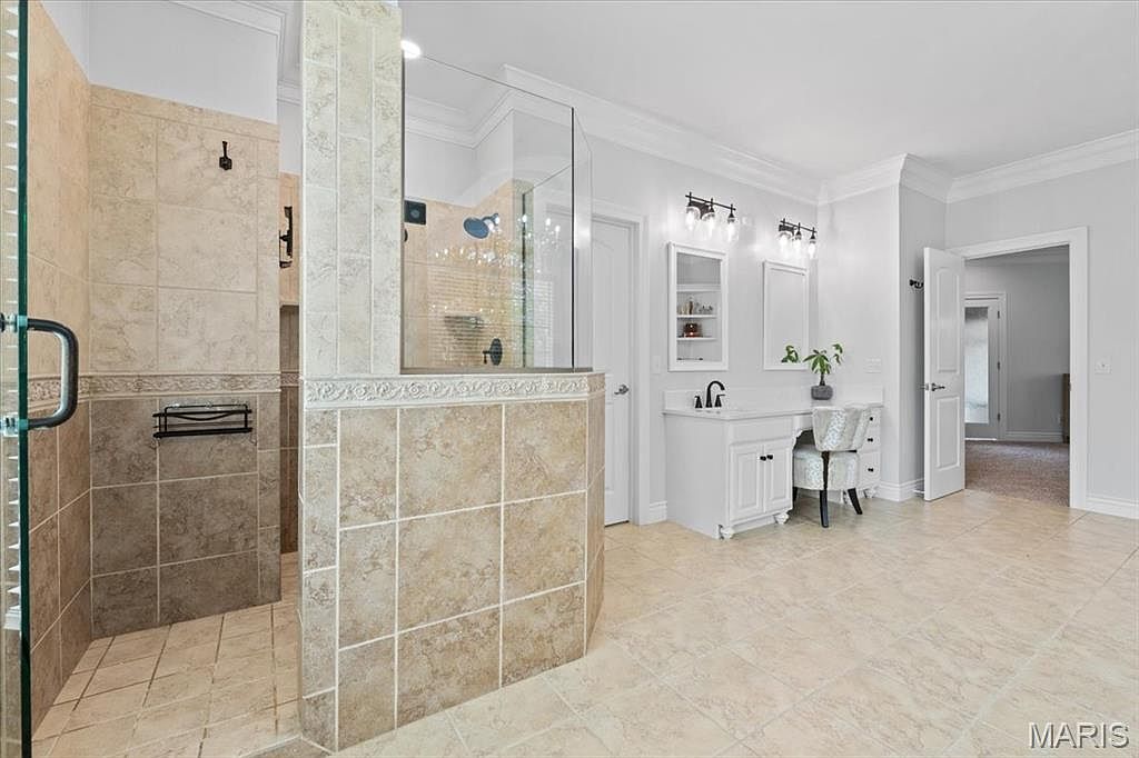 This spacious master bathroom features a large walk-in shower with a combination of beige and light brown tiles extending halfway up the walls, accented by decorative trim. The shower includes sleek black fixtures and a glass enclosure that allows light to pass through, enhancing the open feel. Adjacent to the shower is a white vanity area designed with practicality and style, including a built-in desk space and a stylish chair upholstered in a light pattern. Two modern light fixtures with glass shades brighten the white walls, while the beige tiled floor unifies the space, creating a fresh, elegant ambiance.