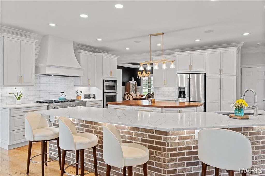 This bright kitchen features a spacious island wrapped in exposed brick with a sleek white marble countertop, offering a striking blend of rustic and modern styles. Four cushioned, white bar stools with dark wooden legs provide inviting seating at the island. The surrounding cabinetry is painted crisp white with gold hardware, enhancing the elegant atmosphere. Stainless steel appliances, including a large refrigerator and double oven, add a polished touch, while the white subway tile backsplash keeps the design cohesive. Warm wooden flooring complements the white tones, and a brass pendant light fixture above the adjacent wooden counter adds subtle luxury. Recessed ceiling lights illuminate the room, creating a welcoming and functional cooking and dining space.