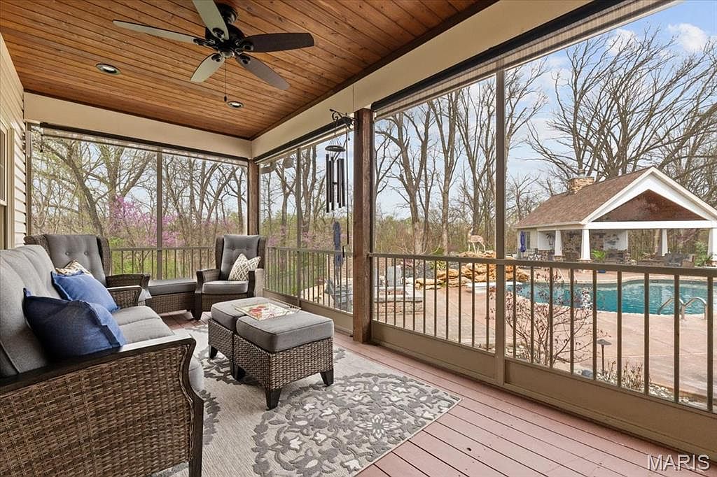 This screened porch offers a serene retreat with views of a sparkling pool and a charming pool house surrounded by tall trees. The space features a warm wooden ceiling with a ceiling fan, enhancing comfort on warm days. Woven furniture in neutral grays blends perfectly with the natural tones of the floor and ceiling, highlighted by coordinating plush cushions in shades of blue and gray for added coziness. A patterned area rug anchors the seating group. The large screens maintain an open, airy feel while protecting from insects, making this an ideal spot for relaxation and entertaining.