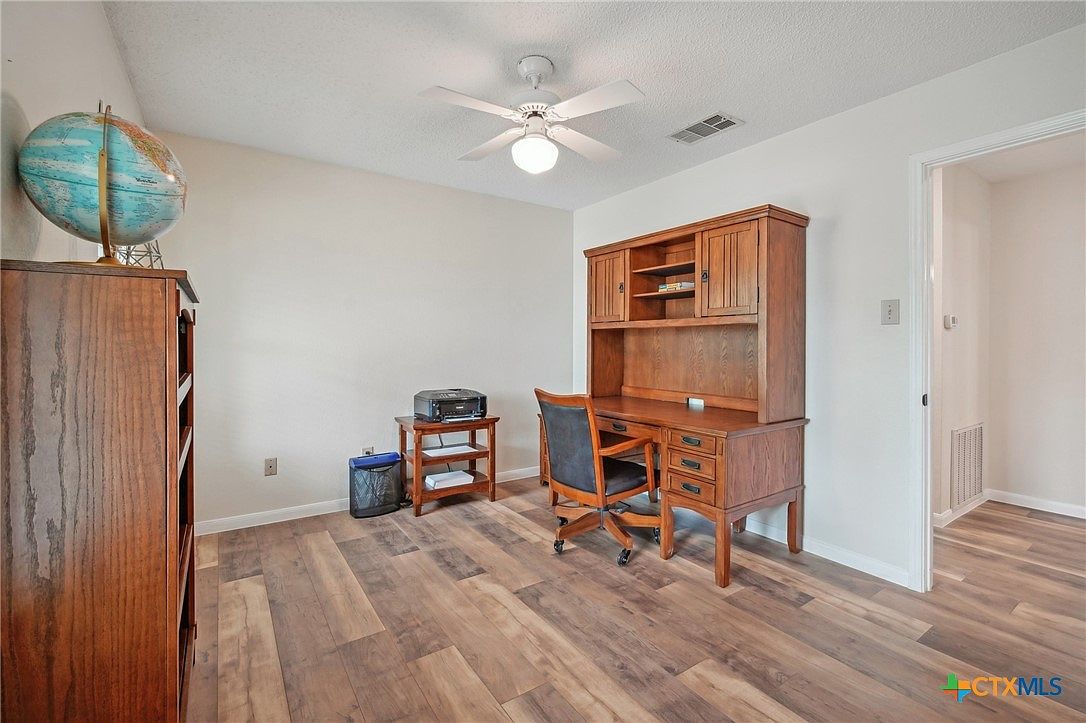 This home office features warm wood tones throughout the furniture and flooring, creating a cozy and productive atmosphere. The room includes a large wooden desk with multiple drawers and built-in shelving for organization, along with a cushioned chair on casters. The wood grain of the furniture complements the varied shades of the laminate floor that mimic natural wood planks. Neutral walls and a white ceiling with a ceiling fan and light offer a clean, airy feel. Minimal décor includes a decorative globe on a tall wood cabinet, emphasizing simplicity and functionality. A small printer stand and wastebasket complete the setup.