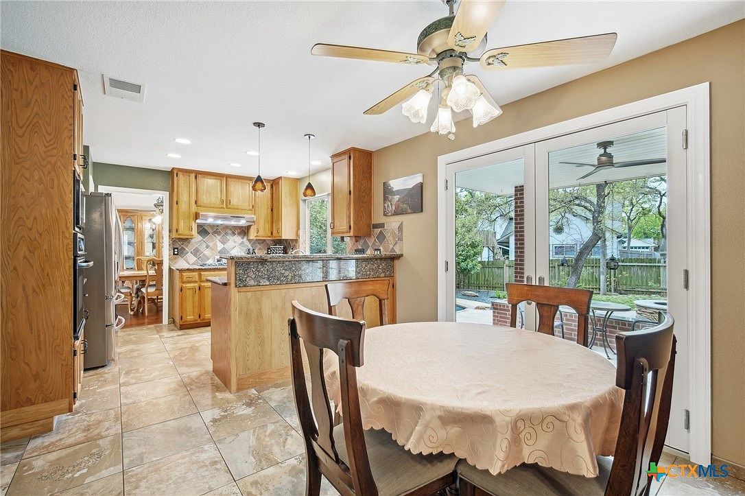 This kitchen and breakfast nook combine functionality with a cozy atmosphere. The space features honey-toned wooden cabinetry paired with granite countertops and a tile backsplash in neutral earth tones with a diamond pattern. Recessed lighting and two pendant lights hang above the raised bar area, enhancing workspace illumination. The interconnected nook offers a round dining table draped in an ivory tablecloth, surrounded by classic wooden chairs. Large sliding glass doors fill the area with natural light and provide direct access to a covered patio and backyard. The ceiling fan with light fixtures adds comfort and practicality to the inviting space.