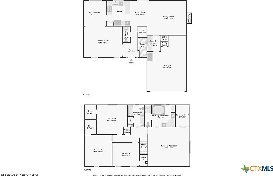 This two-story home features a carefully structured layout promoting ease and functionality. On the first floor, the open family room connects seamlessly to two dining areas and the kitchen, centralizing communal living. A convenient foyer leads inside, while a laundry room and multiple utility closets are positioned near the garage for enhanced organization and access. Upstairs includes a spacious primary bedroom suite with an adjoining bathroom and sizable closet, complemented by three additional bedrooms, a shared bathroom, and extra closet space. The design emphasizes clear spatial flow and practical room allocation for comfortable living.