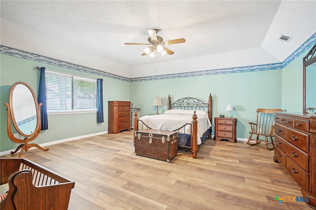 This spacious master bedroom features soft seafoam green walls complemented by a subtle blue and white cloud-patterned border near the ceiling, adding a gentle decorative touch. The room is furnished with classic wooden pieces, including a four-poster bed with intricate metal detailing, matching nightstands, a tall chest of drawers, and a wide dresser with an attached mirror. A vintage-style trunk is placed at the foot of the bed, providing both storage and character. Light wood-look flooring enhances the warm, inviting atmosphere. A rocking chair and a standing oval mirror complete the cozy, timeless aesthetic. Natural light streams in through a large window draped with navy blue curtains, while a ceiling fan with lights hangs centrally overhead.