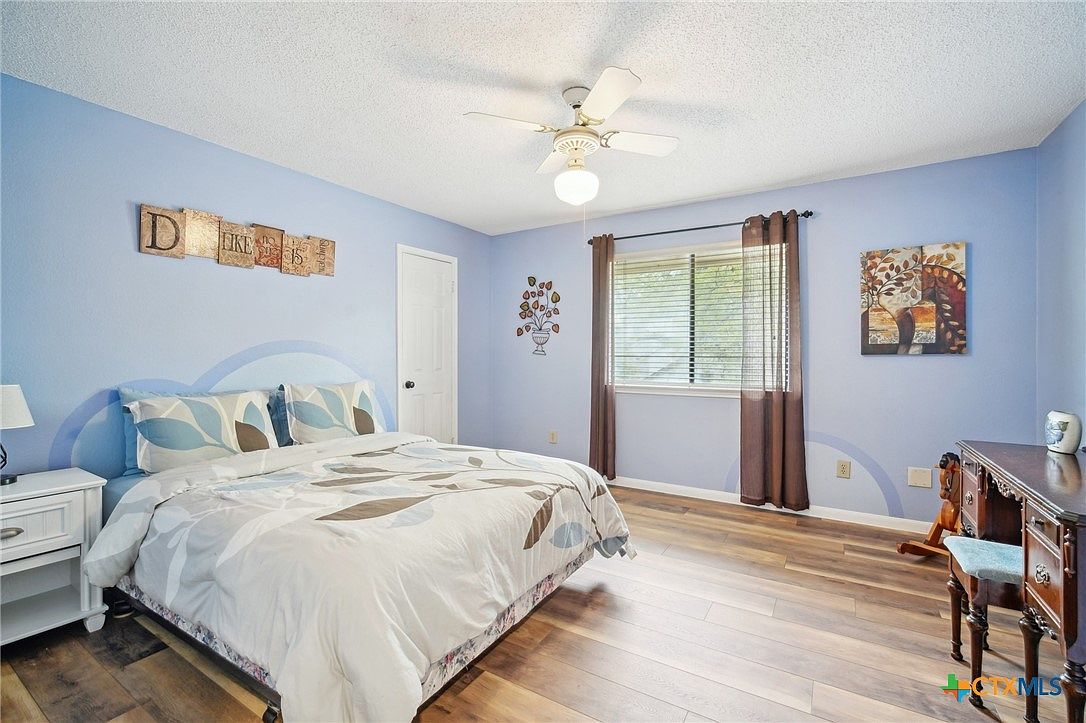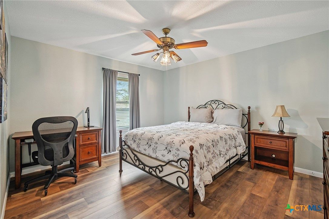 This bedroom balances comfort and functionality with soft, neutral walls creating a calming atmosphere. The wrought iron bed frame with intricate scrollwork adds an elegant vintage touch, complemented by a floral-patterned comforter in light tones. Rich wooden furniture—including a nightstand with a lamp and a desk with a modern black ergonomic chair—introduces warmth and practicality. Natural light filters through simple gray curtains, enhancing the room’s airy feel. A ceiling fan with wooden blades and multiple bulbs casts subtle, inviting shadows across the ceiling. The flooring features wide, warm-toned wood planks that unify the space’s cozy and inviting aesthetic.