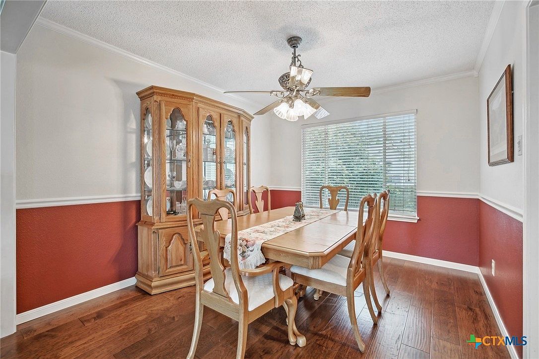 This cozy dining room features a warm, traditional aesthetic. The lower half of the walls is painted a deep terra-cotta red, contrasted by a crisp white chair rail and upper walls, creating a balanced two-tone effect. Rich wood flooring complements the vintage oak dining set, which includes six carved chairs with cream cushions and a rectangular table accented by a floral runner. A large matching china cabinet filled with glassware anchors one corner, while a ceiling fan with ornate lighting hangs centrally. A generous window with horizontal blinds allows natural light to filter softly into the space.
