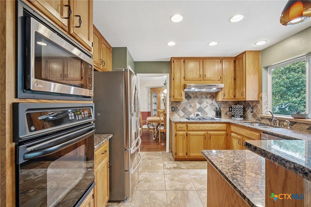 This kitchen features a classic, warm design with natural wood cabinetry and granite countertops throughout. The floor is covered in large, light beige tiles that complement the earth-toned color scheme. Stainless steel appliances, including a double oven, microwave, and a French door refrigerator, add a modern touch. The backsplash showcases a decorative tile pattern in neutral tones, extending behind the gas cooktop and under the vent hood. A spacious window above the sink brings in natural light and a view of lush greenery. Recessed lighting brightens the space efficiently, creating a cozy yet functional cooking area with an open layout leading to the dining room.