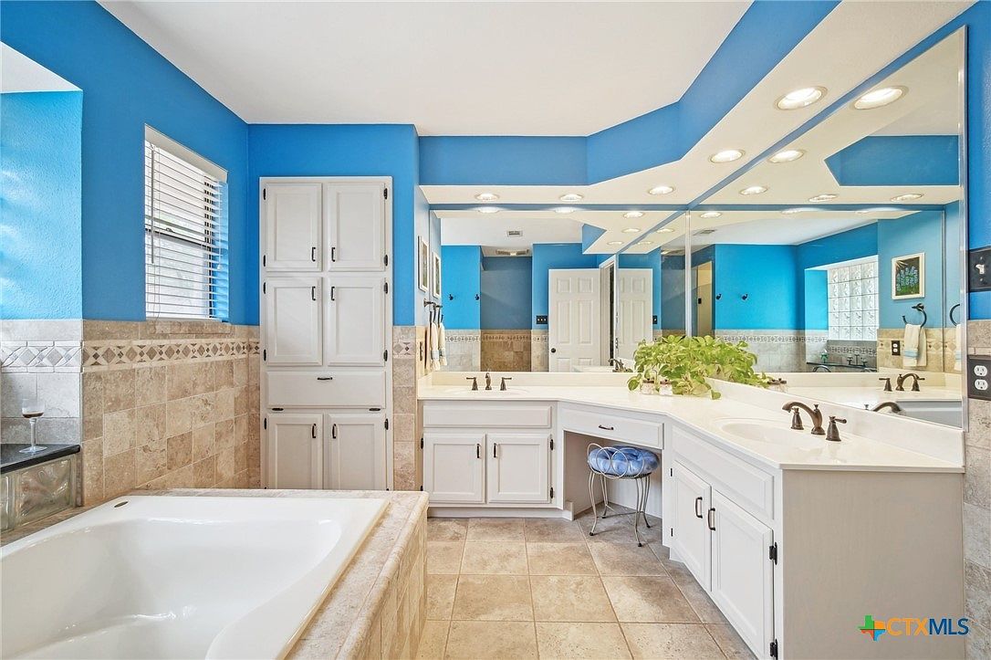 This spacious bathroom features a bright and inviting color scheme with vibrant blue walls contrasted by neutral beige tiles that cover the lower half of the walls and floor. The large bathtub is surrounded by matching tile, creating a cohesive look. A wide L-shaped vanity with white cabinetry provides ample storage and counter space, fitted with dark hardware for subtle contrast. Above the vanity, expansive mirrors with built-in lighting enhance the room’s brightness and reflect the blue tones, creating an airy atmosphere. A small vanity stool with a plush blue seat adds a touch of comfort and elegance to the functional space.